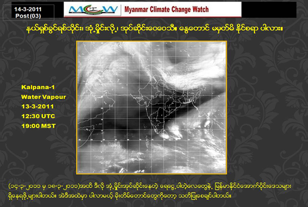 မိုးေလဝသႏွင့္ ဇလေဗဒ ပညာရွင္ ဦးထြန္းလြင္၏ ဝက္ဘ္ဆုိက္တြင္ တင္ထားသည့္ လက္ရွိ ျမန္မာႏိုင္ငံ မိုးေလဝသ အေျချပေျမပံုမုတ္သံုရာသီ မက်ေရာက္မီ ကာလအတြင္း ျဖစ္ေပၚလာႏိုင္သည့္ မိုးေလ၀သ ျဖစ္စဥ္မ်ားကို အထူးဂ႐ုျပဳသြားရန္ႏွင့္ ေလျပင္း တိုက္ခတ္စဥ္ ေျမျပင္၊ ေရျပင္ ေလသည္ ၁ နာရီ လွ်င္ ၃၅ မိုင္ခန္႔ တိုက္ခိုက္ႏိုင္သည္ဟု ယမန္ေန႔ထုတ္ ျမန္မာ့အလင္း သတင္းစာတြင္ ေဖာ္ျပထားသည္။